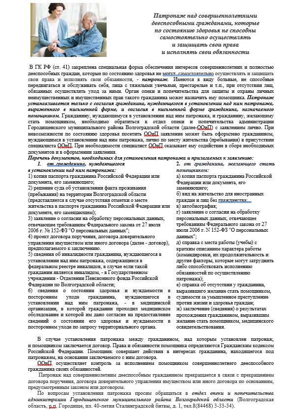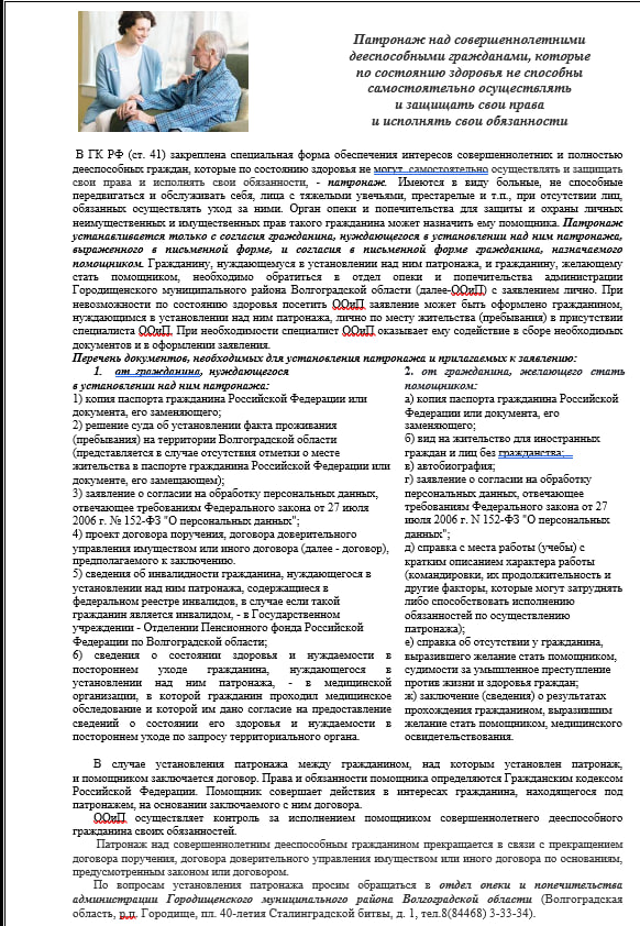 Патронаж над совершеннолетними дееспособными гражданами, которые по состоянию здоровья не способны самостоятельно осуществлять и защищать свои права и исполнять свои обязанности
